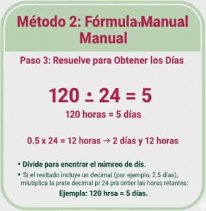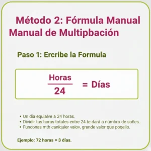 Si no cuentas con una herramienta en línea, puedes convertir horas a días fácilmente de forma manual usando una fórmula sencilla. Es preciso, rápido y te ayuda a entender el proceso de cálculo. Sigue estos tres pasos: