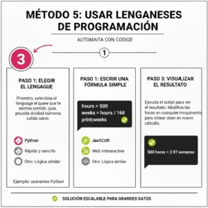 Si tienes conocimientos básicos de programación, puedes automatizar la conversión de horas en semanas mediante código. Es una excelente opción para desarrolladores, analistas o cualquier persona que trabaje con grandes volúmenes de datos de tiempo.