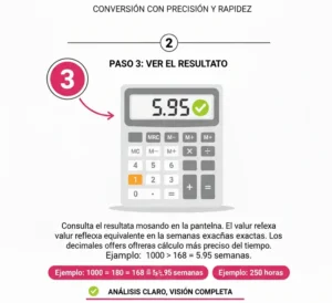 El método más rápido y sencillo es utilizar un convertidor en línea. Nuestra herramienta de Horas a Semanas realiza el cálculo al instante y ofrece un resultado preciso sin necesidad de trabajo manual.