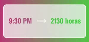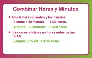 • Combina la hora convertida y los minutos: 14 horas + 30 minutos → 1430 horas.