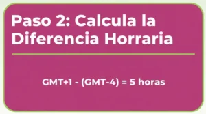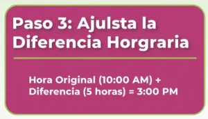 Si prefieres un enfoque práctico, puedes convertir la hora manualmente usando los desfases UTC de cada ubicación. Sigue estos tres pasos:
